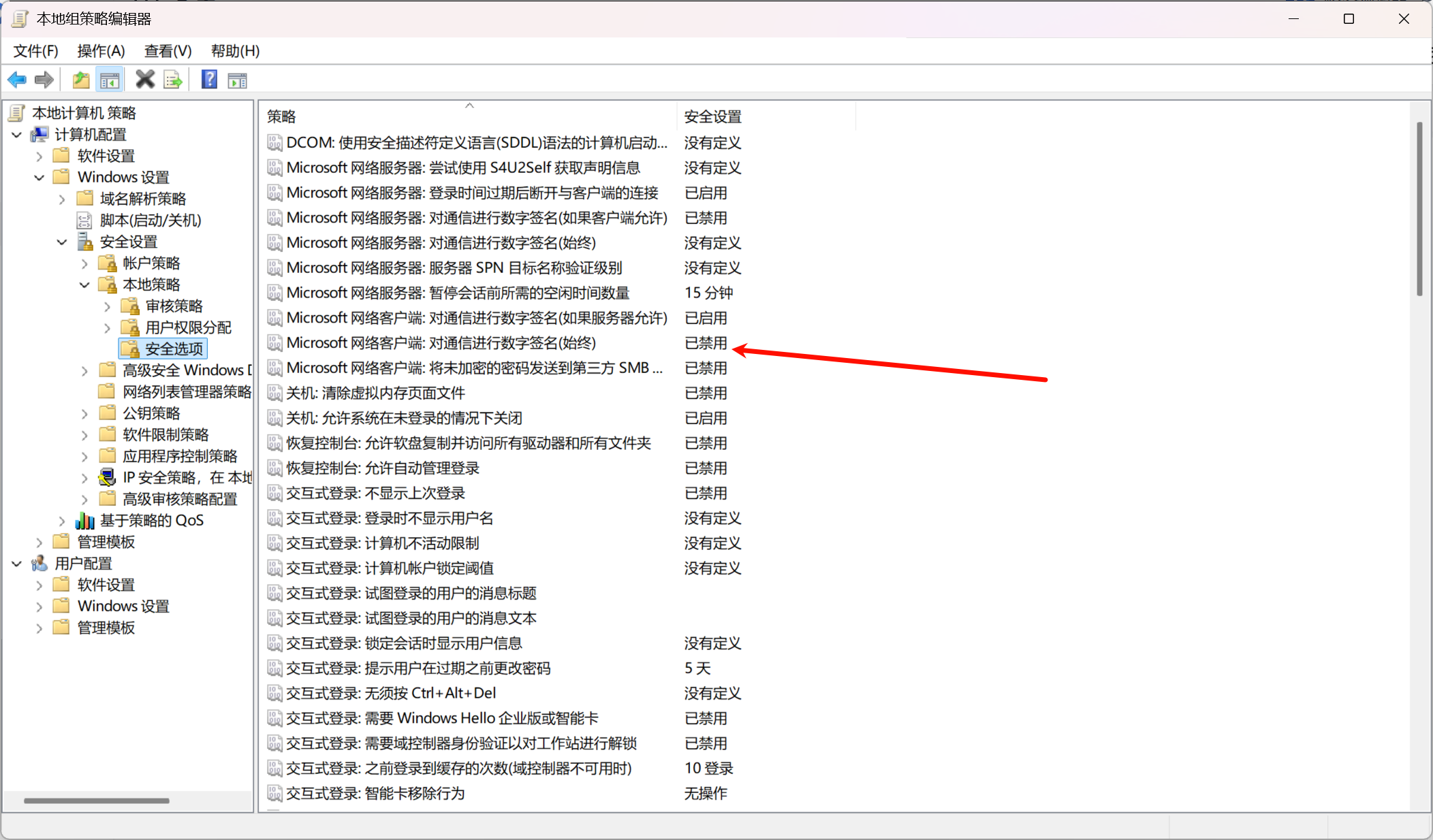 Win + R 输入 gpedit.msc 打开路径:计算机配置-> Windows 设置 -> 安全设置 -> 本地策略 -> 安全选项。把 Microsoft网络客户端:对通信进行数字签名(始终) 改为 已禁用,然后就可以试试能不能连上了。